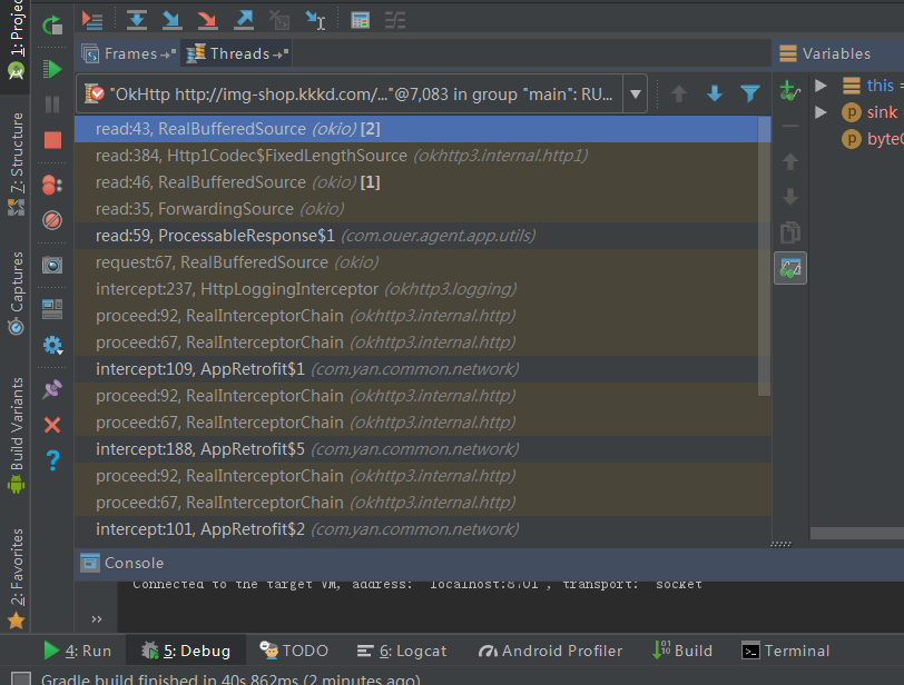 从这张执行图很清晰的可以看到,HttpLoggingInterceptor已经执行了,而这个拦截器其实是我最先设置进去的,也就是说拦截器递归执行返回的时候已经走完了所有的拦截器,自然我们设置的监听的拦截器也被执行了,最终卡在了Okio的read方法里~~
