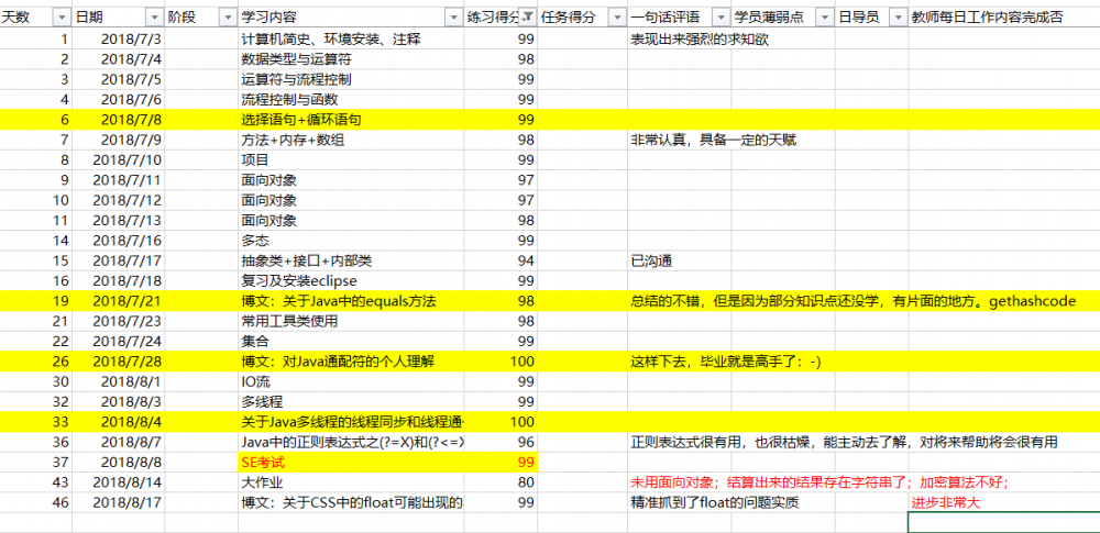 注意,被诊断的学员并不是学的差的学员,相反,他有可能是学的很好的 那一个,今天要诊断 的刘同学,就是这样的一位同学。刘同学来到最课程学习已经50天了,以下是他的学习记录: