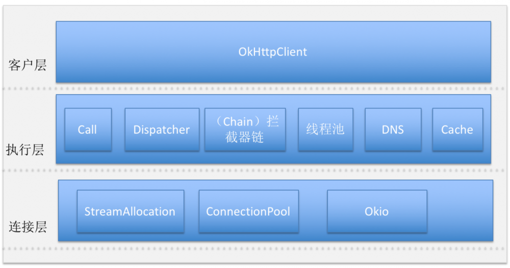 为了方面后面的理解,我这里简单画了个架构图,图中画出了 OkHttp3 核心的功能模块。为了方便整体理解,这里分了三个层次: 客户层、执行层和连接层。