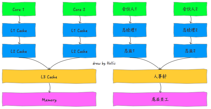 多核CPU就像一家公司是由多个合伙人共同创办的,那么,就需要给每个合伙人都设立一套供自己直接领导的高层管理人员,多个合伙人共享使用的是公司的底层员工。