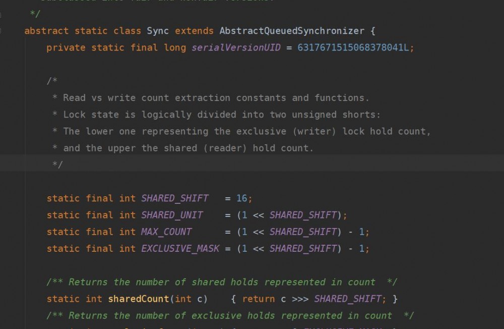 上面就是读写锁的获取和释放过程源码,暂时先分析简单的非阻塞获取锁方法,根据源码我们可以知道,写锁和读锁的是否获取也是判断状态是否不为0,写锁的状态获取方法是 exclusiveCount(c) ,读锁的状态获取方法是 sharedCount(c) 。那么我们接下来分析下这两个方法是如何对统一个变量位运算获取各自的状态的,在分析之前我们先小结下前面的内容。