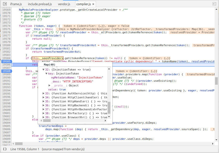 NgModuleProviderAnalyzer 内部通过 Map 类型的 _seenProviders 来记录看到过的供应商。 _getOrCreateLocalProvider 内部判断是否已经看过,如果已经看过会在 _errors 中记录一个 ProviderError 错误。 我用 5.2.2 版本的 Angular 编写了 一个遵循官方文档写法但出现“循环引用错误”的示例项目 。下面是我 ng serve 运行该应用后,在 compiler.js 中添加断点调试得到的结果: