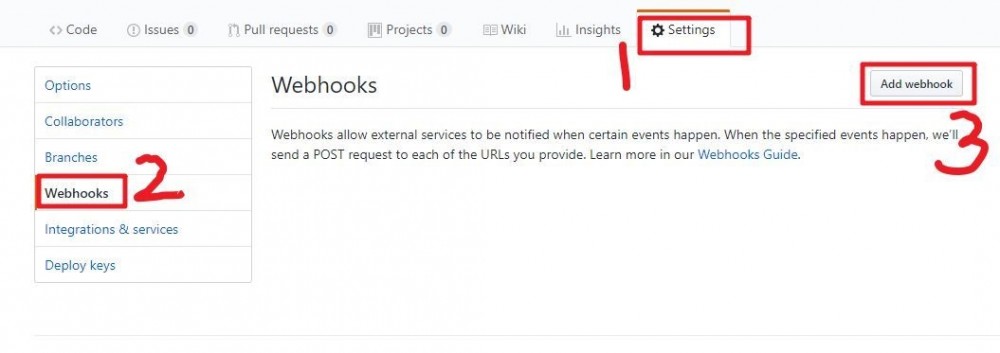 2.在工程主页面点击右上角的”Settings”,再点击左侧”Webhooks”,然后点击“Add webhook”,如下图:
