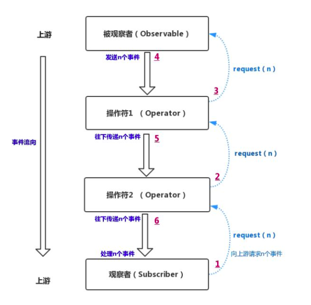 通过在Observer中调用 request(n) 方法,可以实现由消费者来反控生产者的生产,也就是说只有当消费者请求的时候,生产者才去产生数据,当消费者消费完了数据再去请求新的数据,这样就不会出现生产速度过快的情况了,如下图
