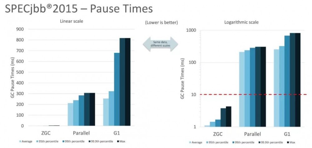 SPECjbb 2015基准测试,在128G的大堆下,最大停顿时间才 1.68ms (不是平均,不是90%,99%,是Max ! ),远低于最初的目标-那保守的10ms,也远胜前代的G1。