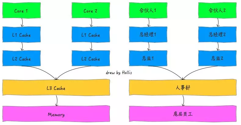 多核CPU就像一家公司是由多个合伙人共同创办的,那么,就需要给每个合伙人都设立一套供自己直接领导的高层管理人员,多个合伙人共享使用的是公司的底层员工。