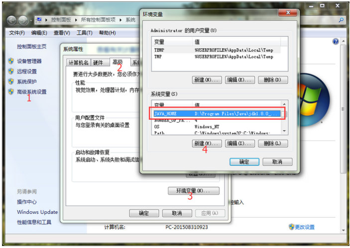 打开系统属性面板(右击“计算机”>”属性”),单击高级系统设置,再单击环境变量,在系统变量中新建一个变量,变量名为M2_HOME,变量值为Maven的安装目录,如图:
