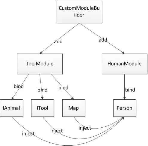 总共有两个Module,一个是ToolModule, 用于绑定 IAnimal接口、ITool接口以及Map对象. 另一个是HumanModule 用于绑定Person对象。