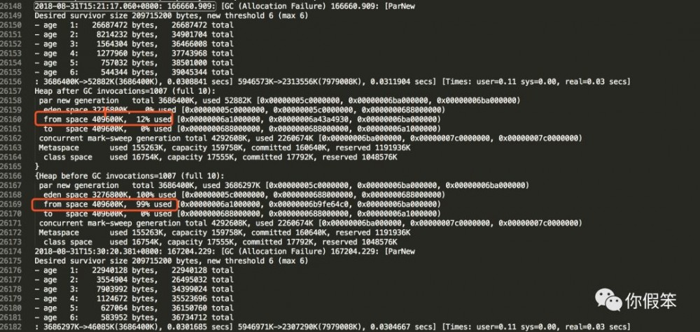 我拿到GC日志后,第一件事就是找到对应的GC日志上下文,这种诡异的现象到底是偶尔发生的还是一直存在,于是我整个日志搜索 from space 409600K, 99% ,找到第一次情况发生的位置,发现并不是一开始就有这种情况的,而是到某个时候才开始有,并且全部集中在中间某一段时间里,那我立马看了下第一次发生的时候的上下文,发现之前有过一次Full GC和一次CMS GC