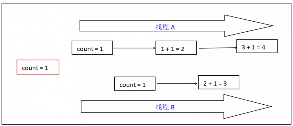 进入这个方法之后首先要读取count的值,然后修改count的值,最后才把这把值赋值给count, 总共包含了三步过程:“读取”一>“修改”一>“赋值” ,既然这个过程是分步的,那么我们先来看下面这张图,看看你能不能看出问题: