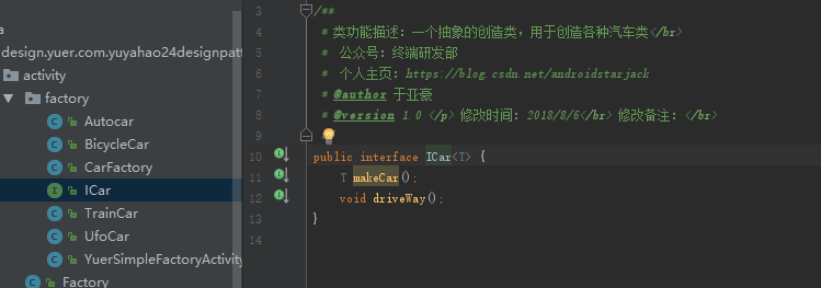 典型例子:车子继承vehicle(车)类,有小汽车卡,公交车bus等,车子工厂实现工厂接口,工厂接口有抽象方法vehicle produce vehicle(String type)方法,车子工厂中实现工厂方法vehicle produce vehicle(String Type),方法中根据需要new新的车子。