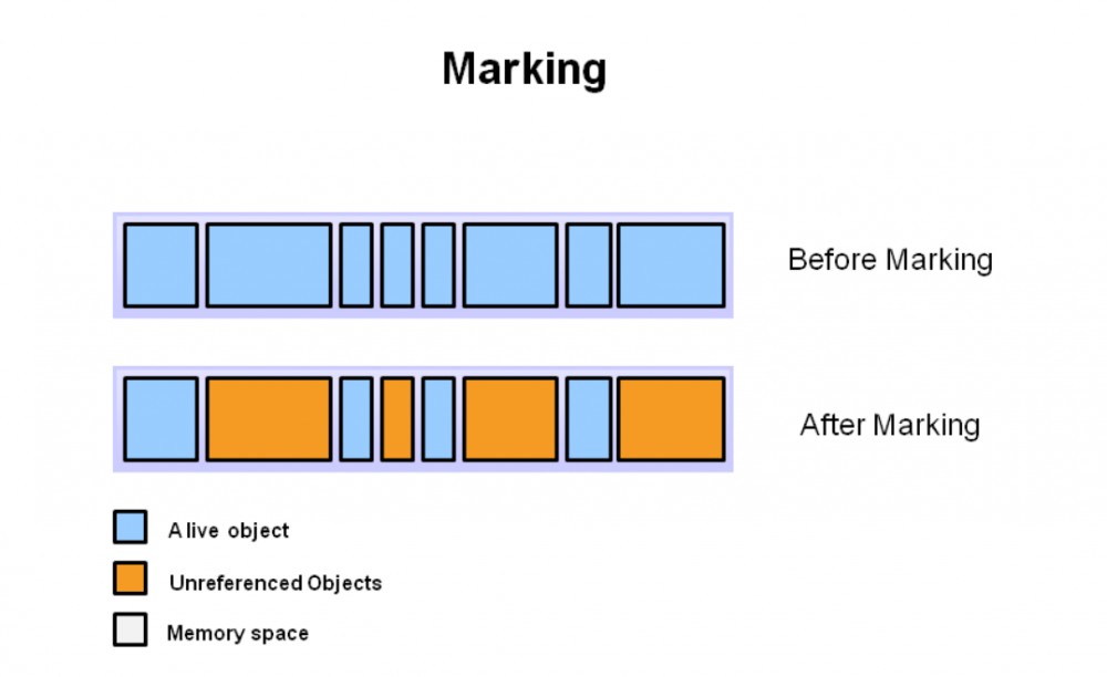 这个过程的第一步叫做标记。这一阶段,垃圾回收器识别哪些内存正在使用,哪些内存未被使用。