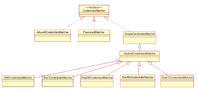 以上我们知道了CredentialsMatcher所处的认证的位置及作用,下面就要详细看看具体的匹配过程,还是接口设计图:
