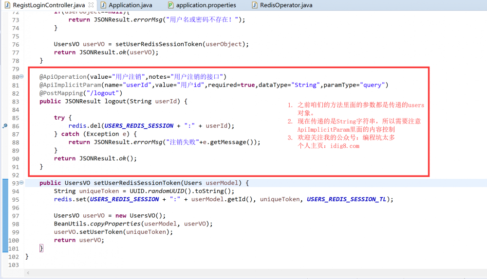 注销的功能,直接写在springboot的controller里面就可以了,通过删除redis的方式来完成用户的注销功能。源码:https://github.com/limingios/wxProgram.git 中No.15