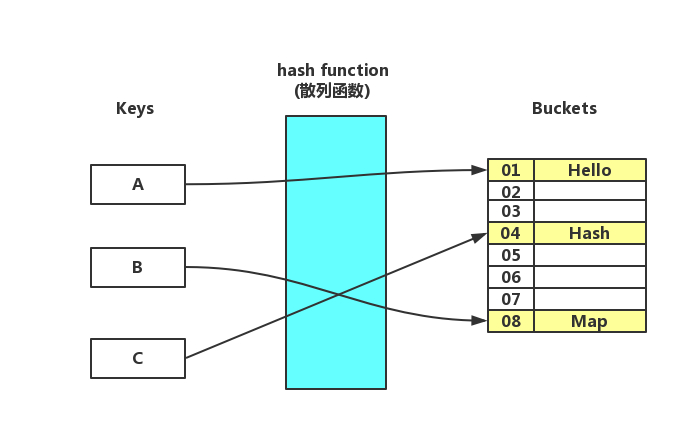 散列表中维护了一个数组,数组的每一个元素被称为一个桶(bucket),当你传入一个 key = "a" 进行查询时,散列表会先把key传入散列(hash)函数中进行寻址,得到的结果就是数组的下标,然后再通过这个下标访问数组即可得到相关联的值。