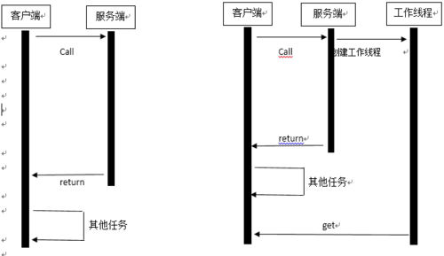 先看看请求返回的时序图,明显传统的模式是串行同步执行的,在遇到耗时操作的时候只能等待。反观Future模式,发起一个耗时操作后,函数会立刻返回,并不会阻塞客户端线程。所以在执行实际耗时操作时候客户端无需等待,可以做其他事情,直到需要的时候再向工作线程获取结果。