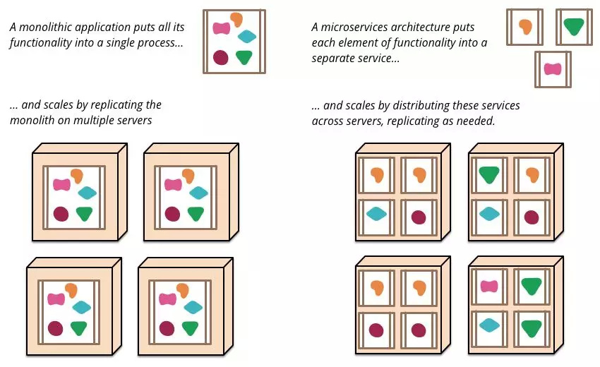 Martin Fowler 认为微服务架构与单体应用最大的区别在于, 微服务架构将一个完整的单体应用拆分成多个有着独立部署能力的业务服务,每个服务可以使用不同的编程语言,不同的存储介质,来保持低限度的集中式管理 。下面这张图,很好的说明了单体架构和微服务架构的区别。