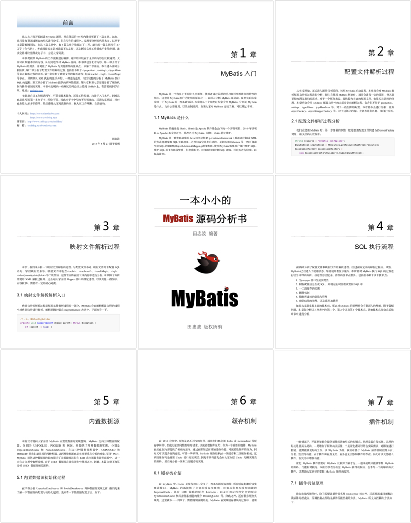 经过两周紧张的排版,《一本小小的MyBatis源码分析书》诞生了。本书共7章,约300页。下面来看看本书的缩略图。