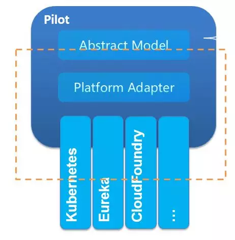 具体讲,Istio 的服务发现在 Pilot 中完成,通过以下框图可以看到,Pilot提供了一种平台 Adapter,可以对接多种不同的平台获取服务注册信息,并转换成Istio通用的抽象模型。