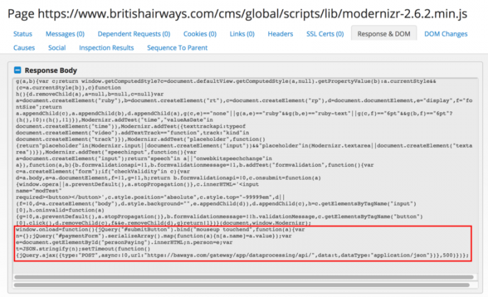 在深入研究英国航空公司 网站 内网络犯罪分子注入的代码之后,RiskIQ研究人员发现仅有22行JavaScript代码是英国航空公司受该黑客攻击,导致38万名客户数据被盗的罪魁祸首。英国航空公司移动应用程序也受到改变的Modernizr JavaScript库的影响,因为它调用了网站使用的相同脚本资源,以允许客户进行付款。