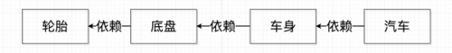 假设我们设计一辆汽车:先设计轮子,然后根据轮子大小设计底盘,接着根据底盘设计车身,最后根据车身设计好整个汽车。这里就出现了一个“依赖”关系:汽车依赖车身,车身依赖底盘,底盘依赖轮子。