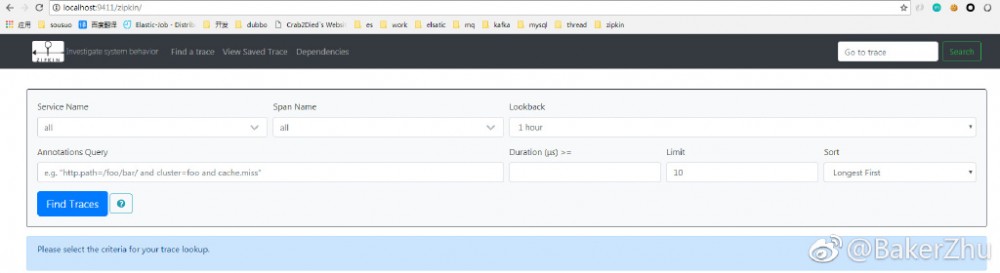 输入 http://localhost:9411/zipkin/ 进入WebUI界面如下