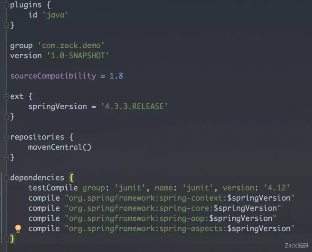 创建一个Gradle项目,添加对应的Spring与AOP的依赖。 (Gradle和Maven类似,都是自动化构建的工具。但与Maven相比,Gradle是基于groovy,采用DSL格式,具有更强的灵活性、简洁性、拓展性。现在连Spring的官方源码都是用Gradle的,可以说是一款面向未来的工具,后续也值得我们深入学习。)