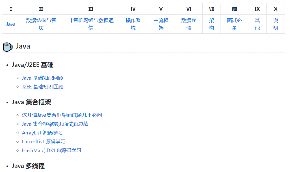 项目中介绍了 Java 基础和 J2EE 基础,Java 集合框架,多线程,JVM,设计模式,数据结构,计算机网络与通信,操作系统等大量内容。