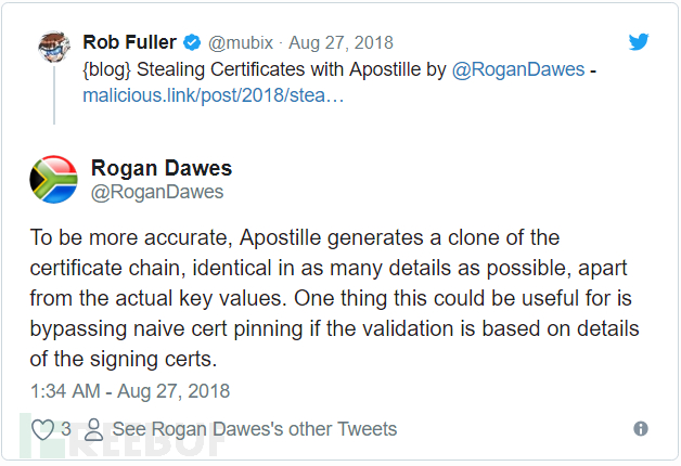 在DefCon 26上, @singe 和 @_cablethief 发表了关于企业无线攻击的精彩演讲。如果你仔细观看了之后放出的演讲视频,你应该能注意到其中他们提及了一个叫做“Apostille”的工具。这是一款由 @Sensepost 团队成员 Rogan Daweska 开发的,证书窃取(克隆/伪造)工具。但在演讲中他们并未过多介绍,这也是促使我写这篇博文的原因。
