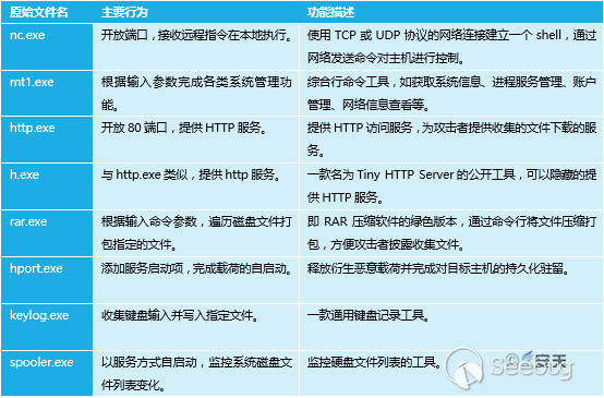 在2007年,安天对来自该地区的网络入侵活动进行了应急响应,表1-1是在相关被攻击的服务器系统上所提取到的相关攻击载荷的主要行为和功能列表。