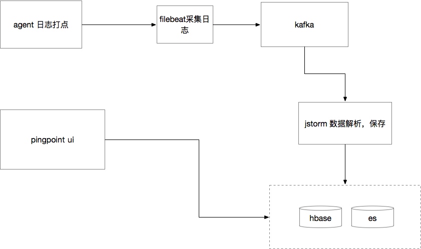 所有sender打印的日志都写在pinpoint.log文件下,具体文件的位置是jar包启动的环境变量, 然后,运维会通过firebeats将日志进行实时搜集,发送到kafka, 由jstorm的topology消费,在将数据写入到hbase,自己基于pinpoint的tcp的receiver进行改造,数据写入到hbase