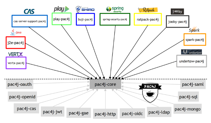pac4j-oauth module pac4j-cas module pac4j-http module pac4j-openid module pac4j-saml module pac4j-gae module pac4j-oidc module pac4j-jwt module pac4j-ldap module pac4j-sql module pac4j-mongo module pac4j-stormpath module.