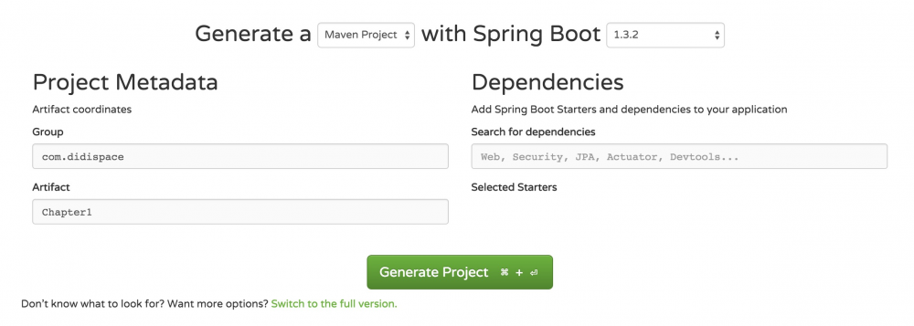 http://start.spring.io/ Maven Project 、Spring Boot版本 1.3.2 以及一些工程基本信息,可参考下图所示