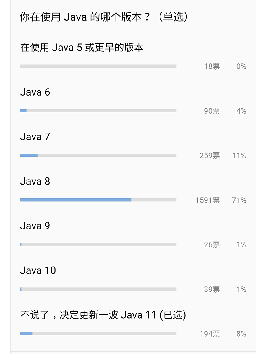 9月25日我们在开源中国的微信公众号( oschina123 )上发起了一个小调查, 结果显示 71% 的参选用户正在使用 Java 8 ,还有不少用户留言表示暂时没有升级计划。