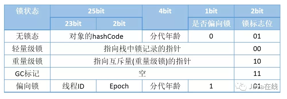 对象头分为两个部分,第一部分存储自身的 运行时数据 ,如对象的哈希码、GC分代年龄、锁标志位等。这部分数据的长度在32位和64位的虚拟机中分别为32bit和64bit,官方称它为“Mark World”,Mark Word被设计为一个非固定的数据结构,以便在极小的内存空间内存储尽量多的信息,它会根据对象的状态复用自己的存储空间。32位HotSpot虚拟机对象头Mark Word存储内容如下: