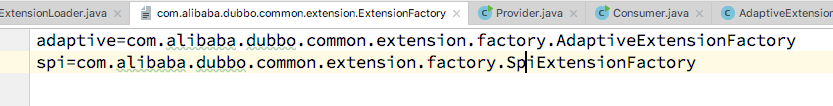 这里有个type.getAnnotation(SPI.class),这个type就是刚刚再初始化ExtensionLoader的时候传入的,我们先看type=ExtensionFactory.class的情况,ExtensionFactory接口类上有@SPI注解,但是value为空,然后三次调用loadFile方法,分别对应Dubbo扩展点的三个配置文件路径,在源码中我们可以找到ExtensionFactory对应的文件,