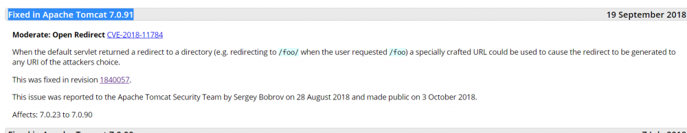 打开 Tomcat官网版本7首页 ,可以看到 Fixed in Apache Tomcat 7.0.91 中修复了该漏洞。