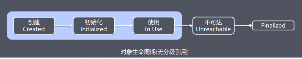 ## 2.1 无分级引用对象生命周期 前面提到,分层引用的模型是用于内存回收,没有分级引用对象下,一个对象从创建到回收的生命周期可以简单地用下图概括:对象被创建,被使用,有资格被收集,最终被收集,阴影区域表示对象“强可达”时间: