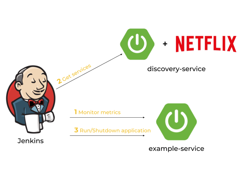 每一个包含 Spring Boot Actuator 库的 Spring Boot 应用程序都可以在 /actuator/metrics 端点下公开 metric 。许多有价值的 metric 都可以提供应用程序运行状态的详细信息。在讨论自动伸缩时,其中一些 metric 可能特别重要: JVM 、CPU metric 、正在运行的线程数和HTTP请求数。有专门的 Jenkins 流水线通过按一定频率轮询 /actuator/metrics 端点来获取应用程序的指标。如果监控的任何 metric 【指标】低于或高于目标范围,则它会启动新实例或使用另一个 Actuator 端点 /actuator/shutdown 来关闭一些正在运行的实例。在此之前,我们需要知道当前有那些实践在提供服务,只有这样我们才能在需要的时候关闭空闲的实例或启动新的新例。