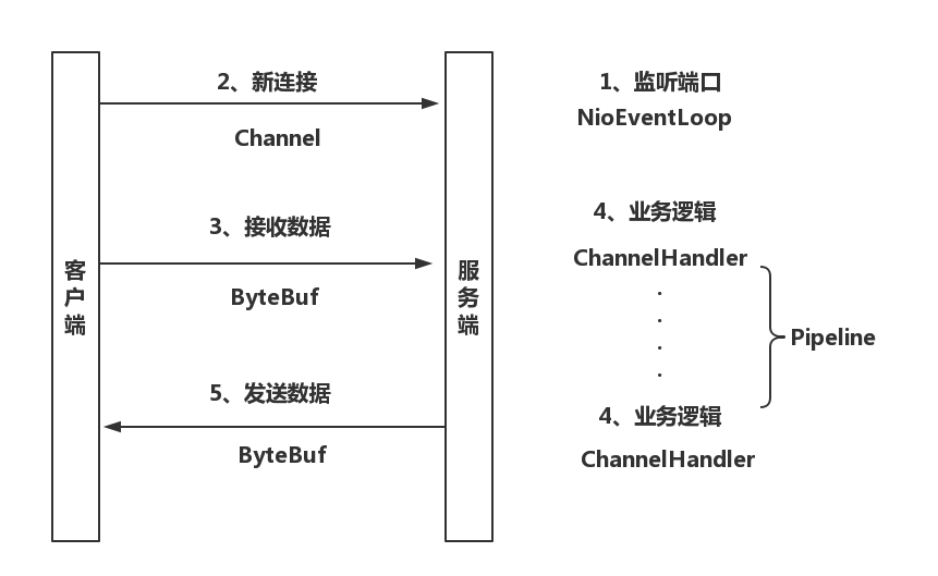 以上四个做为Netty的基本组件,可以理解为Netty把我们之前网络编程中使用到的各部分都进行了优化和高性能的封装,对比到实际的通信流程中,可以简单的用下图直观的表示