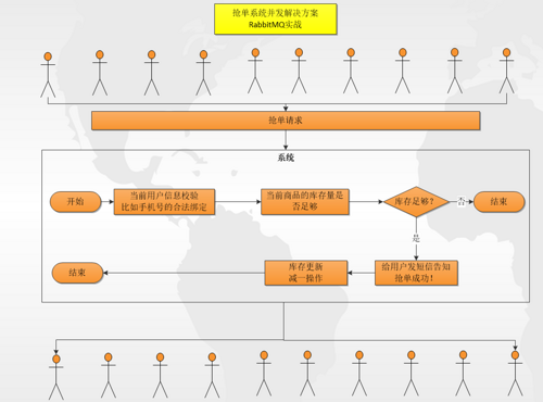 下面,我们用 RabbitMQ 来实战上述的第二点!即我们会在“请求” -> "处理抢单业务的接口" 中间架一层消息中间件做“缓冲”、“缓压”处理,如下图所示: