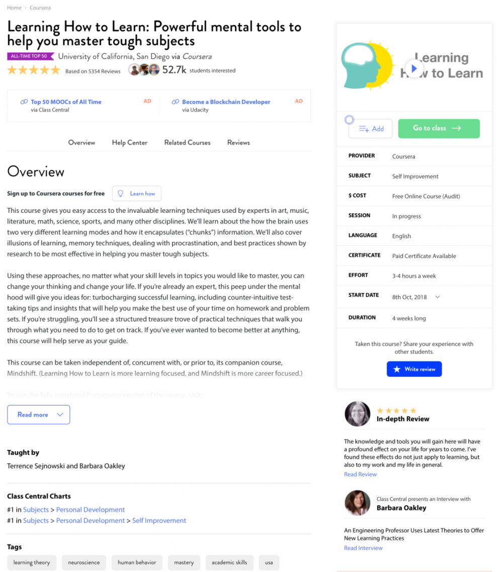 Class Central 为每门在线课程都提供了详细的介绍页面,以 Coursera 上很火的 Learning How to Learn 为例,页面头部是课程的总体评分和学员人数。左侧是课程的概述和导读,左侧下方有 Tags 可以快速地找到具备相关话题的其他课程。页面右上方是课程的提供方、价格、开课时间、证书、课业量等信息,右下方则是精选的学员评价。