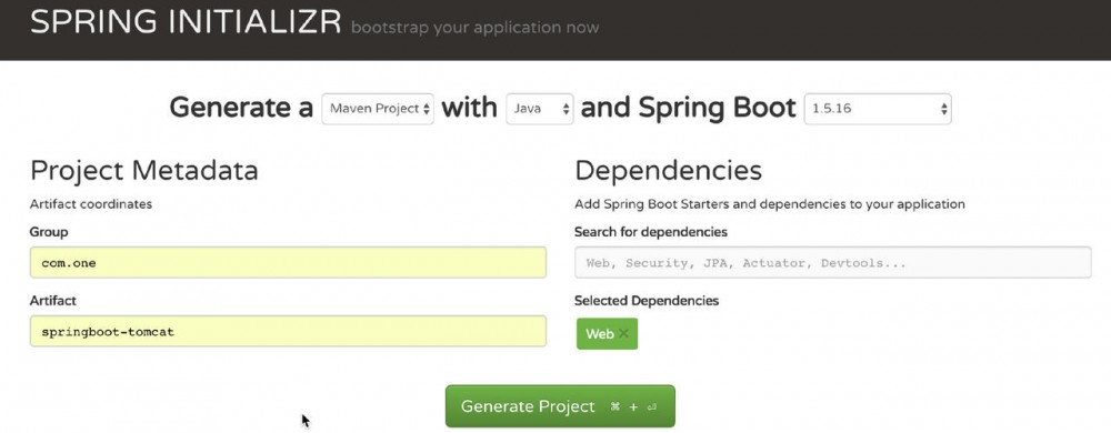 利用Spring Initializr 工具下载基本的 Spring Boot 工程,选择 Maven 方式构建, 版本为正式版1.5.16, 只选择一个 Web 依赖.