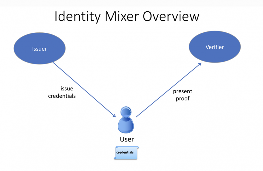 Idemix流中涉及三个参与者:用户,发行者和验证者。
