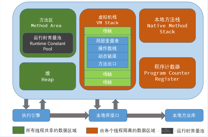 内存空间(Runtime Data Area)中可以按照是否线程共享分为两块,线程共享的是方法区(Method Area)和堆(Heap),线程独享的是虚拟机栈(VM Stack),本地方法栈(Native Method Stack)和PC寄存器(Program Counter Register)。