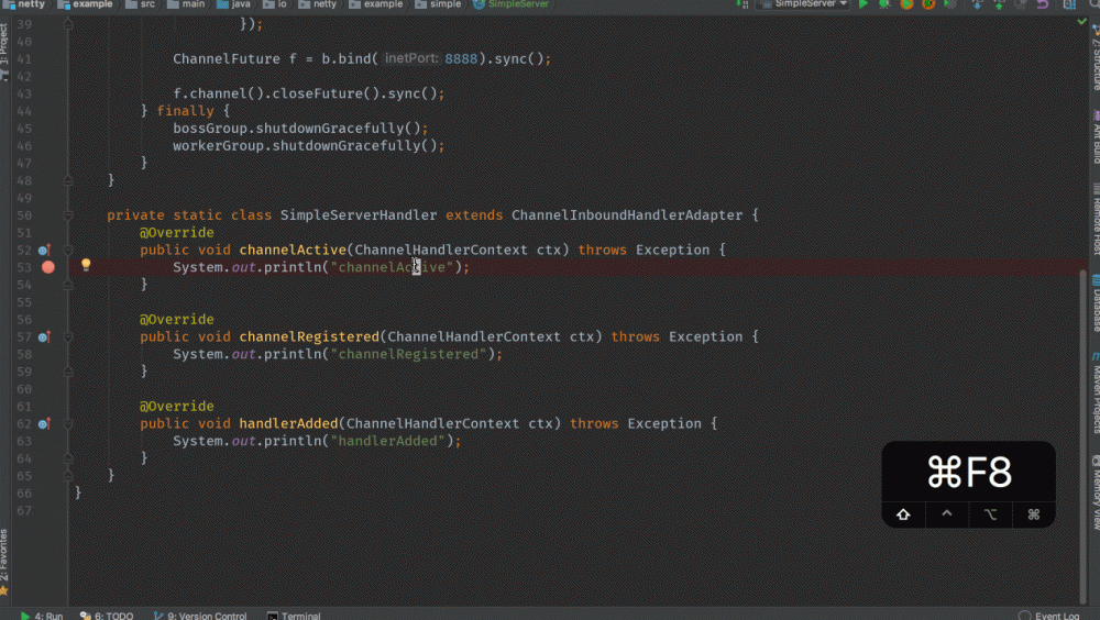 ChannelFuture f = b.bind(8888).sync(); 这里就是真正的启动过程了,绑定8888端口,等待服务器启动完毕,才会进入下行代码