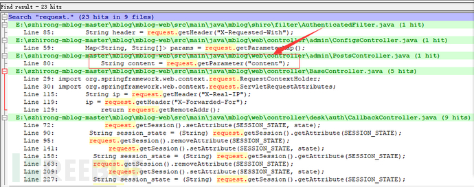下载此源码解压之后发现40多M,比较大的一个源码了,如果遇到这样比较大的源码,可以使用一些辅助工具去手工审计比如Notepad++,可以快速定位位置和查询一些关键字去审计,比较快,但是这样去审计可能一些逻辑安全问题发现不了,但是有利就有弊,这只是代码审计常用方法之一了,具体是哪些关键字比如可以查看所有用户输入的地方,会不会结合一些危险函数去执行。比如XSS,可以全局搜索”request.”关键字,结果如下: