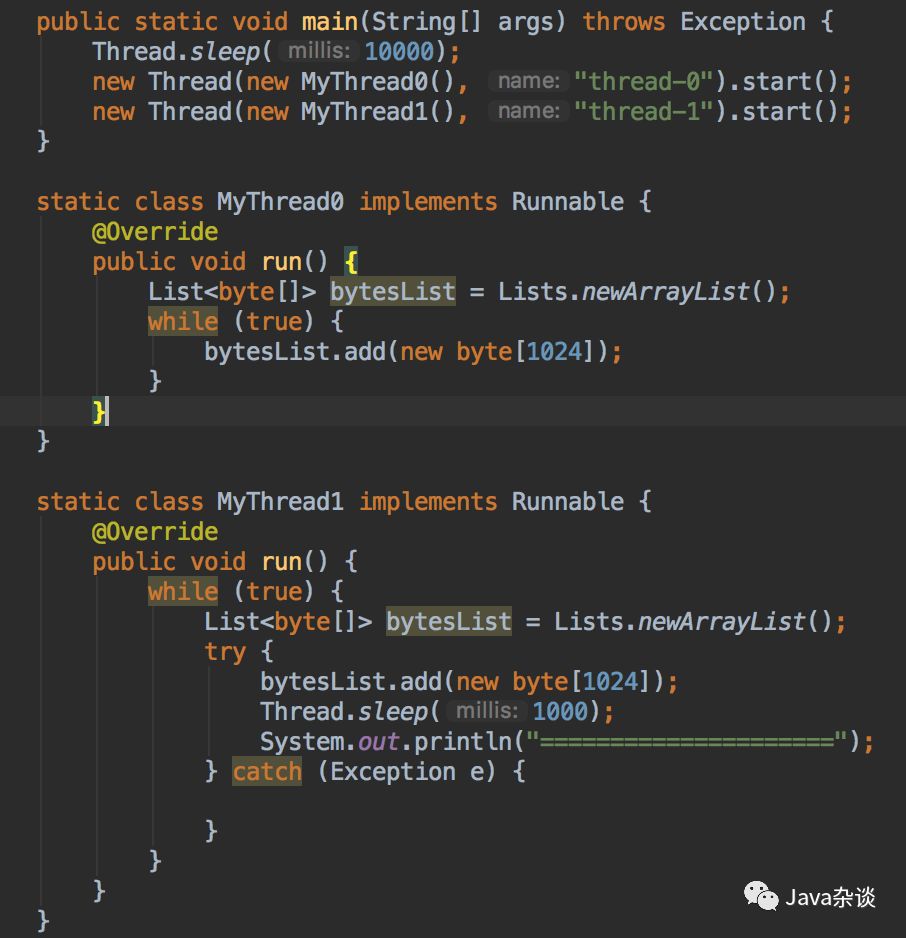 清楚了内存分配原理之后,我们就可以以此为基础来分析各种情况。比如:在MyThread0中bytesList放在try中,代码如下: