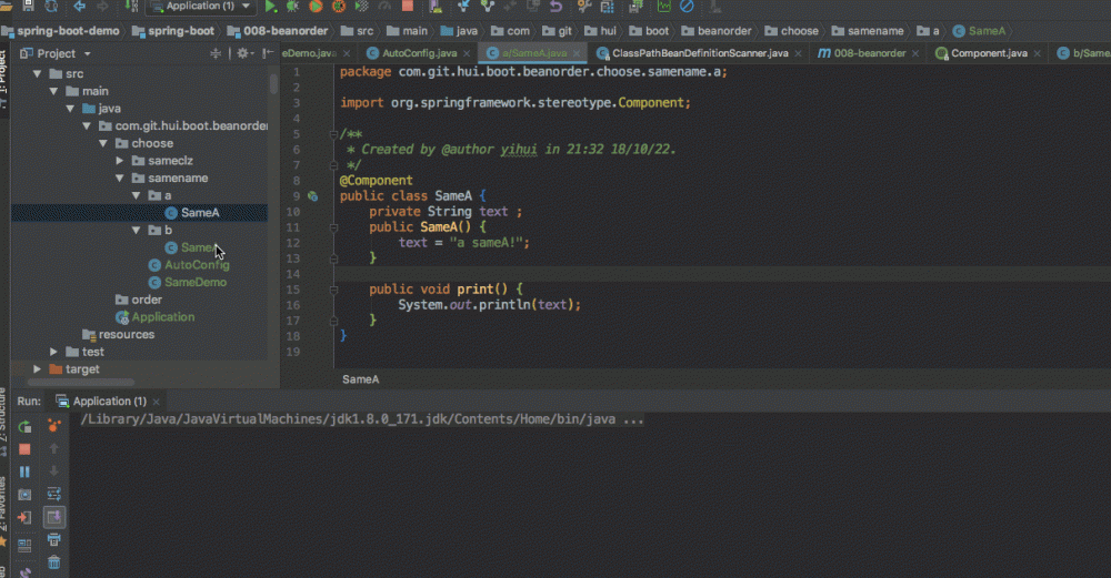 先来个case演示下同名bean的情况,如下定义两个bean,除了包路径不一样外,类名相同,通过 @Component 注解方式声明bean,因此两个bean的beanName都是 SameA