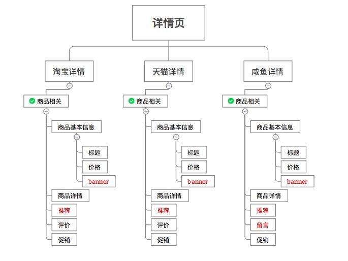 假设有这么三个详情页,我们设定一个大前提,底层的数据层提供方都是一套的,商品详情展示的服务完全可以做到复用,即三个性情页中,绝大多数的东西都一样,只是不同的详情页车重点不同而已。